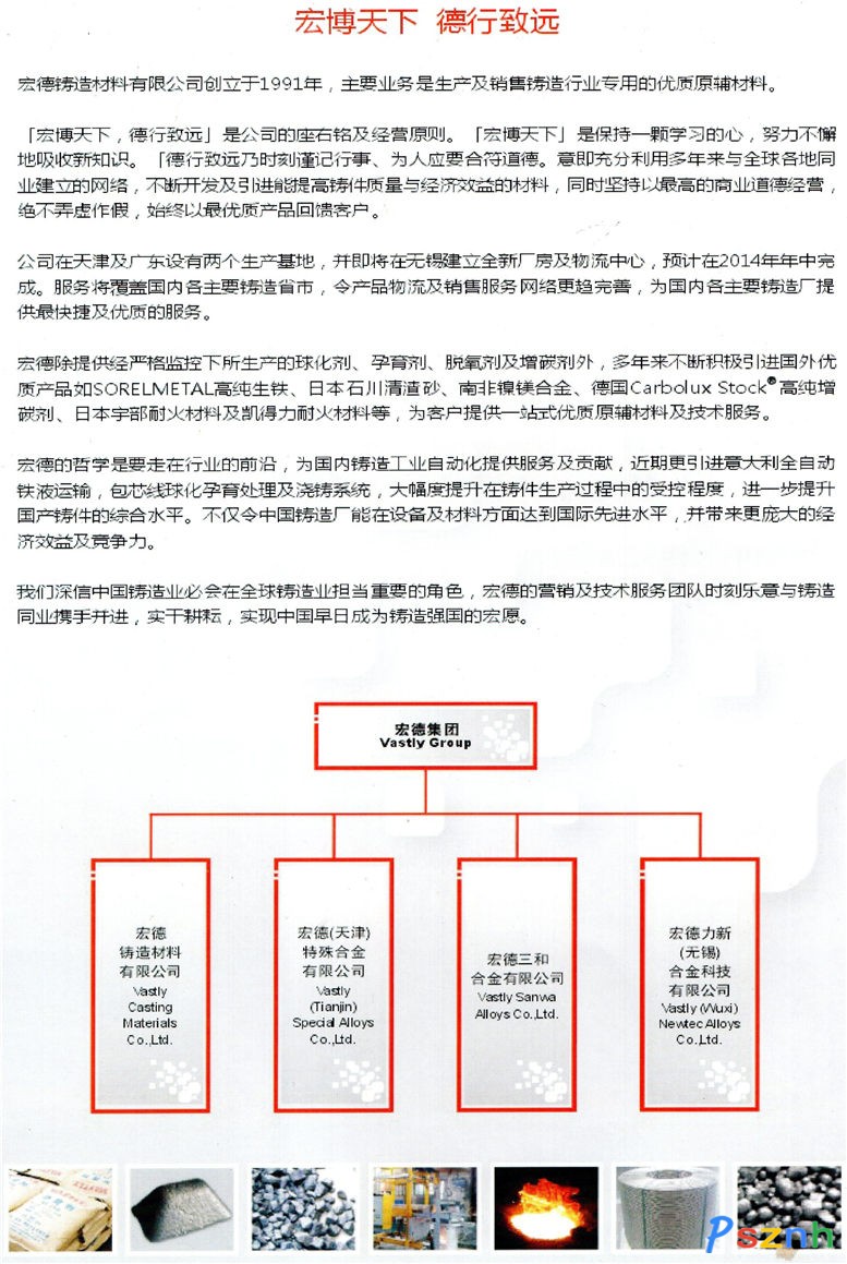 宏德一方面供应经严格品控的球化剂、孕育剂、脱氧剂及增碳剂外,多年来不断积极引进国外优质产品如SORELmetaL高纯生铁、日本石川清渣砂、德国碳保高纯增碳剂、日本宇部耐火材料、英国Tennant型内孕育块及凯得力耐火材料等,为客户提供一站式优质原辅材料及技术服务。