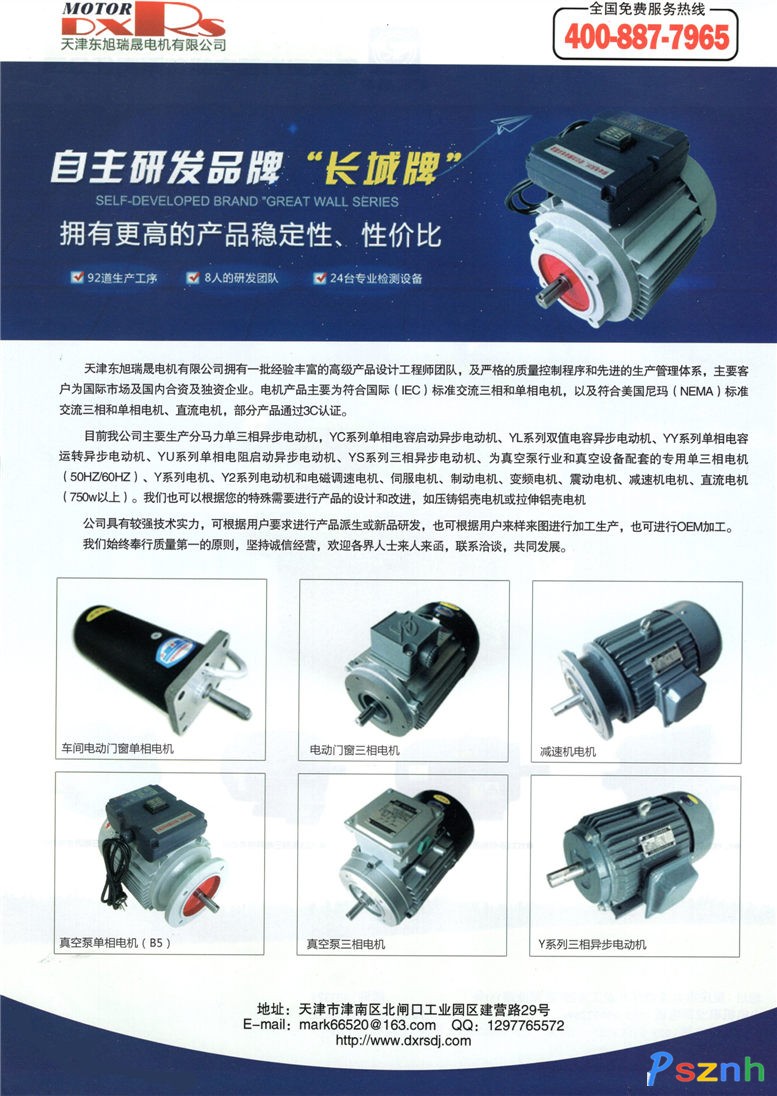 天津东旭瑞晟电机有限公司拥有一批经验丰富的高级产品设计工程师团队,及严格的质量控制程序和先进的生产管理体系,主要客户为国际市场及国内合资及独资企业。电机产品主要为符合国际(IEC)标准交流三相和单相电机,以及符合美国尼玛(NEMA)标准交流三相和单相电机、直流电机,部分产品通过3C认证。