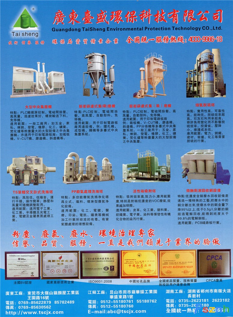 经营范围:集(吸)尘设备、活性碳吸附设备、酸碱废气处理设备、铜回收设备、脱硫设备、锅炉辅配件设备、水处理产品及设备、各款物料回收设备、各款风机电镀设备、通风设备、水洗台、烤箱、滚筒线等机械制造和加工、环保工程安装、环保项目咨询、服务、及评估。雄厚的技术力量,丰富的生产经验,先进的工艺设备,齐全的检测手段,品质已达到国际水平,高效率的服务态度,为贵公司解决环境污染营造良好的投资环境,协助客户事业辉煌腾达。