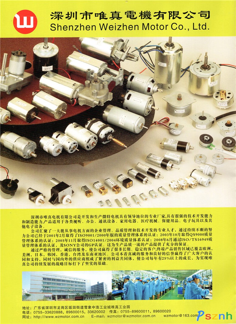 深圳市唯真电机有限公司是开发和生产微特电机的专业厂家,具有很强的技术开发能力和制造能力,产品适用于各类视听、办公、通讯设备、家用电器、医疗器械、保健用品、电子玩具以及其它电子设备。 公司汇聚了一大批从事电机方面的企业管理、品质管理、生产管理、和技术开发的专业人才,通过持续不断的努力公司已经于2001年初取得了IS09000/2000质量管理体系的认证;2003年9月取得了QS9000质量管理体系的认证,2005年9月取得IS014001环境质量体系认证,这为生产品质一流的产品提供了充分的保证。通过严格的管理、诚信的服务,使公司赢得了一大批长期、稳定的客户,诸如:TOSHIBA、MATSUSHITA、THOMSON、JVC、PIONEER、SANYO、LG、SAMSUNG、SHINWA、 NIOEC PIGEON、VALLEY WOOD、 FORYOU等知名企业均直接或间接采用我们的产品。终端产品销售区域已覆盖欧洲、美洲、日本、香港、台湾及东南亚地区。 公司本着真诚的服务和良好的信誉赢得了广大客户的认同和支持,同时与国内外的供应商组成紧密的利益共同体,使公司步入了良性发展阶段,为实现唯真公司持续发展的战略目标打下了坚实的基础。