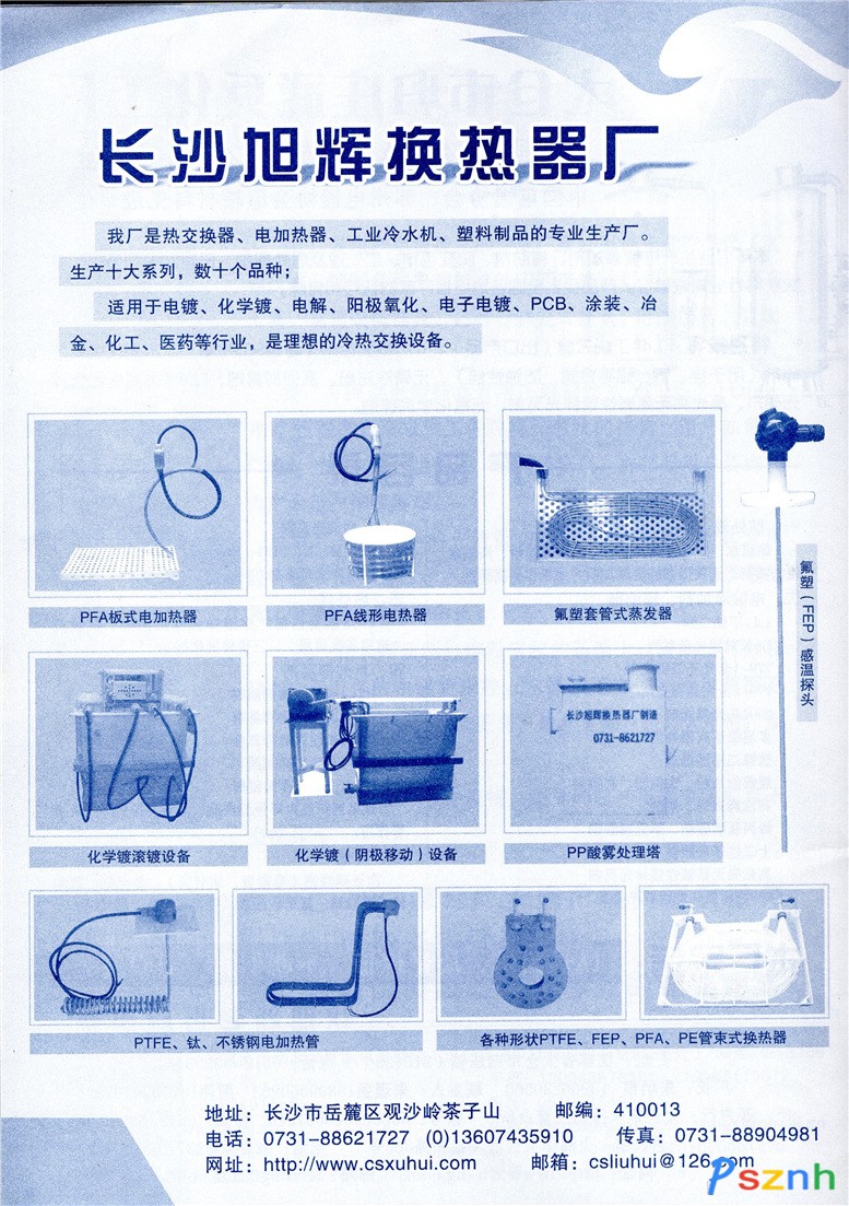 长沙市开福区旭辉换热器厂是热交换器、电加热器、工业冷水机、塑料制品的专业生产厂。生产十大系列,数十个品种。 适用于电镀、化学镀、电解、阳极氧化、电子电镀、PCB、涂装、冶金、化工、医药等行业理想的冷热交换设备。 产品的结构级材料使用范围   PTFEPPPE热交换器、冷凝器   PTFE、钛、不锈钢电热器、换热器   FEP感温器、电气控制箱   带钢酸洗、化学镀加热、生产设备   阳极氧化冷却设备、工业冷水机   PPPVC、塑料非标设备