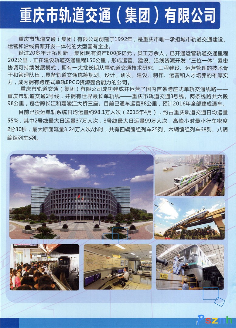 轨道集团于2005年成功建成并安全运营国内首条跨座式单轨交通线路——重庆轨道交通2号线。截至2016年12月31日,已开通运营2条单轨线路、2条地铁线路,运营里程超213公里。按照重庆市委、市政府加快形成大都市区交通一体化布局的要求,轨道集团将深入贯彻落实“四个全面”战略,以“创新、协调、绿色、开放、共享”的发展理念引领企业发展,紧紧围绕“建设服务运营、运营促进经营、经营反哺运营”的可持续发展战略,加密中心区域轨道交通线路,推动轨道交通向城市发展新区延伸,使轨道交通在重庆公共交通出行中发挥更重要的作用。
