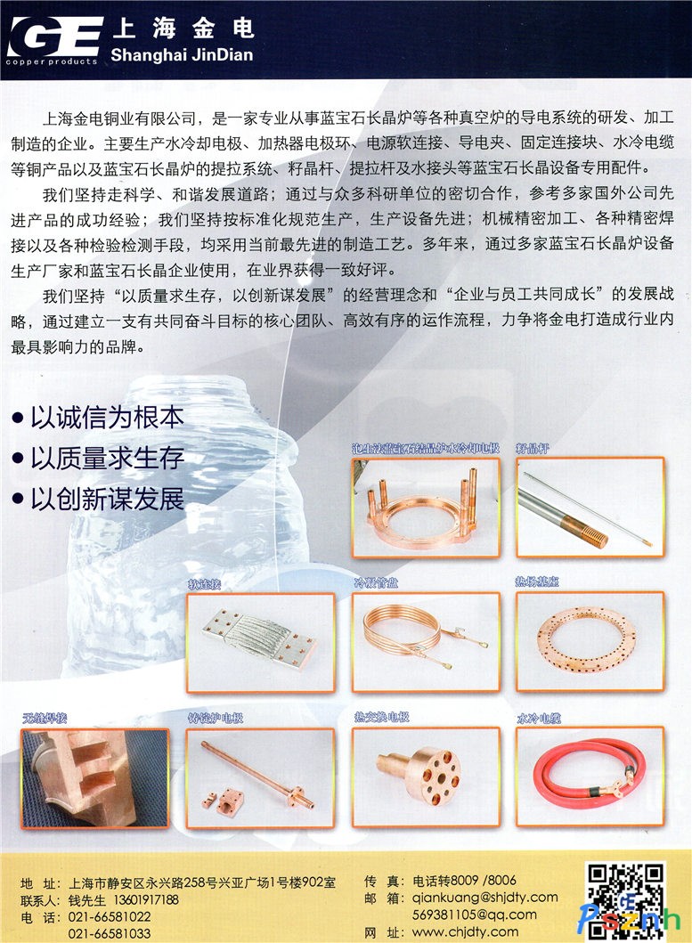 主要生产蓝宝石长晶炉水冷却导电电极、各种真空炉的导电电极、热场基座(电极环)、导电软连接、软连接连接座、导电夹等纯铜导电系统的系列产品;蓝宝石长晶炉的提拉系统,不锈钢电极水接头等产品。
