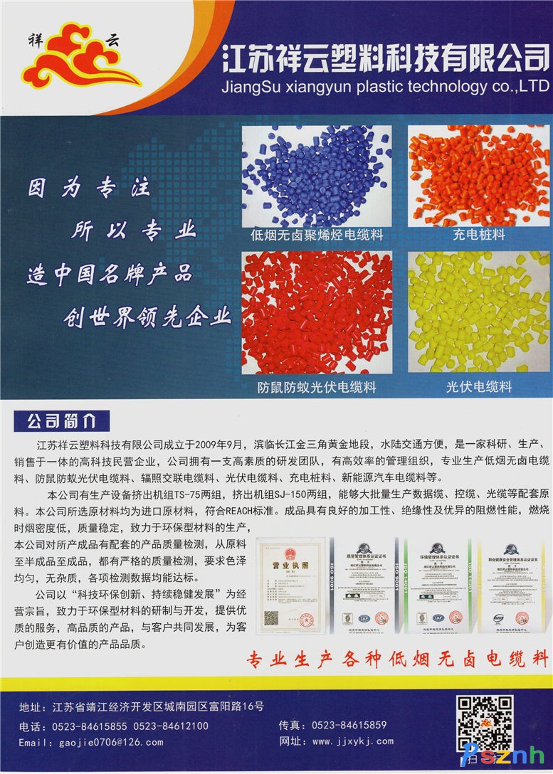 江苏祥云塑料科技有限公司成立于2009年9月,滨临长江金三角黄金地段,水陆交通方便,是一家科研、生产、销售于一体的高科技民营企业,公司拥有一支高素质的研发团队,有高效率的管理组织,专业生产低烟无卤电缆料、防鼠防蚁光伏电缆料、辐照交联电缆料、光伏电缆料、充电桩料、新能源汽车电缆料等。