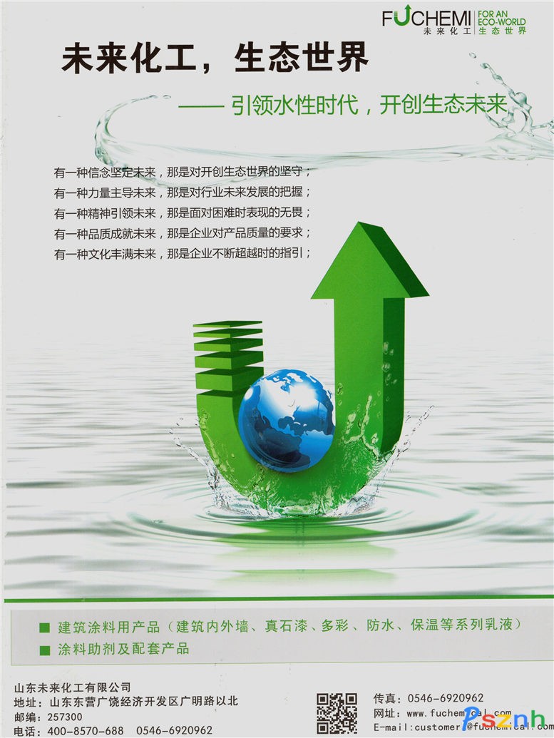 山东未来化工有限公司目前国内较大的乳液制造商和销售商之一,公司创建于2008年,坐落于石油之城——东营广饶经济开发区。现有员工300余人,其中科研技术人员60余人。荣获国家发明专利和实用新型专利数项,有两个项目获得国家科技型中小企业创新基金支持,近期有五项国家发明专利正在申请。 公司产品主要包括水性乳液、水性胶粘剂两大类,涵盖建筑涂料、防水涂料、水包水多彩涂料、真石漆、防火涂料、水性木器漆、水性工业漆、化纤、玻纤、PVC手套涂饰剂、造纸化学品等领域 |