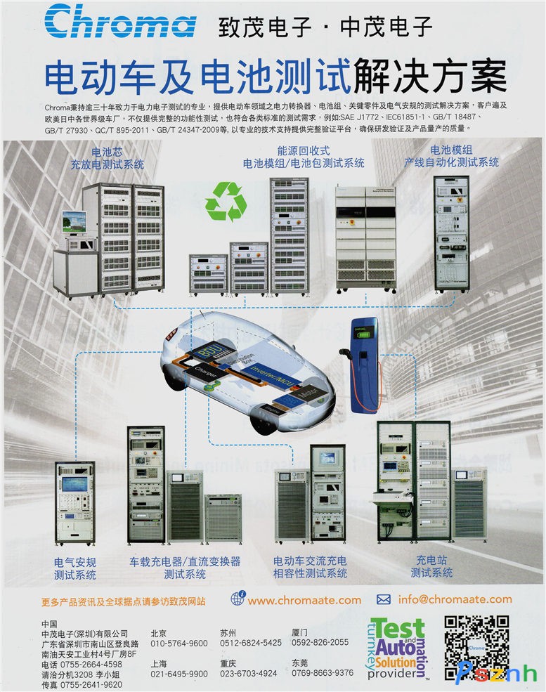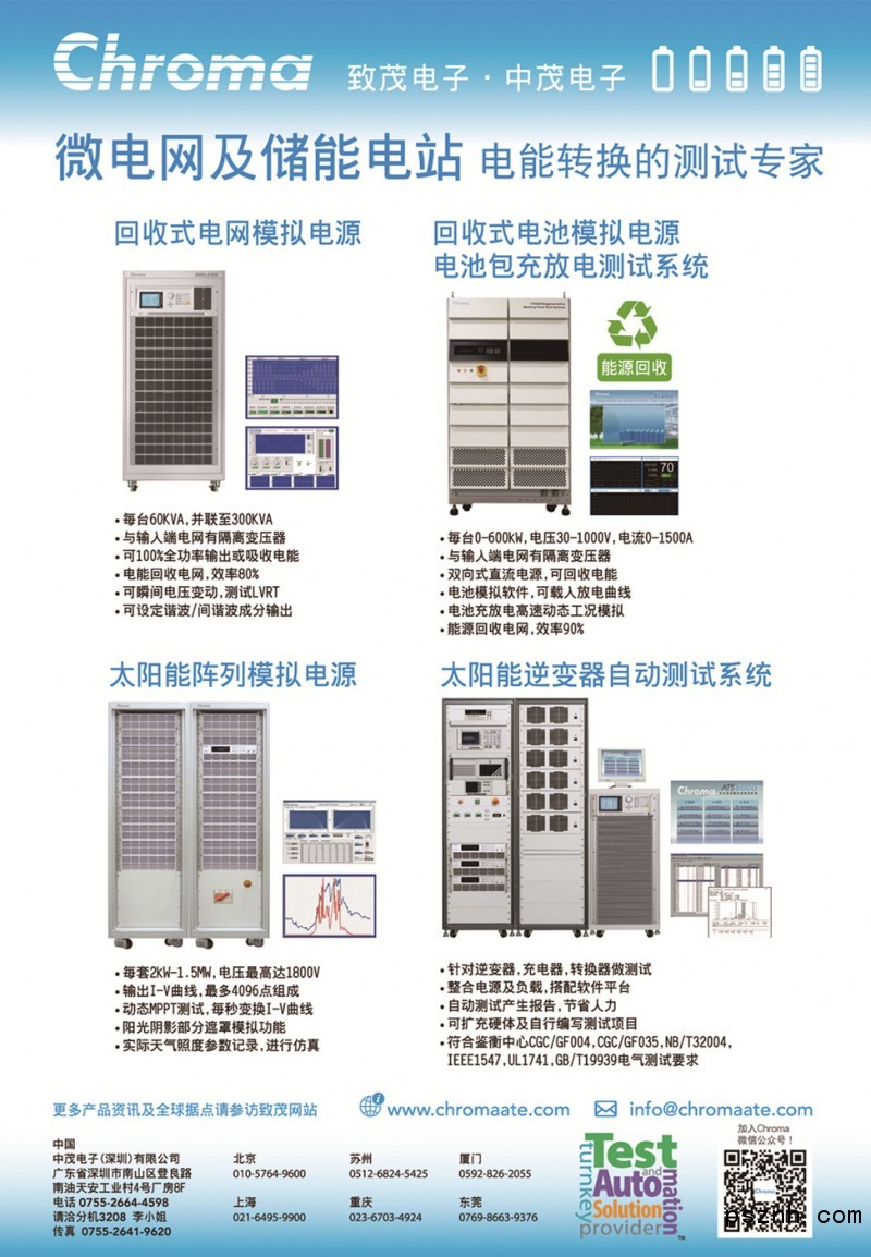 中茂电子(深圳)有限公司成立于1984年,以自有品牌”Chroma”行销全球,为精密电子量测仪器、自动化测试系统、制造资讯系统与全方位Turnkey测试及自动化解决方案供应商,主要产品包括LED 、太阳能、锂电池、电动车、半导体/IC、雷射二极体、平面显示器、视频与色彩、电力电子、被动元件、电气安规、热电温控、自动光学检测、以及制造资讯系统等测试解决方案。