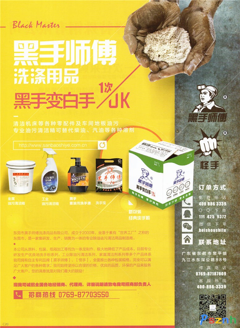 东莞市黑手师傅洗涤用品有限公司成立于2000年,公司位于美丽富饶的广东省东莞市常平九江水工业区,主要生产洗手粉系列产品(黑手粉、黑手洗手粉、黑手师傅洗手粉、黑手王洗手粉、一次OK洗手粉、洁宝洗手粉、洗手宝洗手粉、黑手洗手液等)、工业清洗剂系列(油污清洁剂、机头水、全能水、地板清洁剂、发动机清洁剂等)、家庭洗涤系列(洗衣液、洁厕精、玻璃清洁剂、抽油烟机清洁剂等)。生产技术和生产设备都是引进日本、台湾等先进国家和地区。是集研发、生产、销售一体的实业公司。公司高层技术管理长期致力于研发保护工人师傅因生产工作时对自身有害的劳保洗护产品,为此开发出一代又一代集除油去污、洁肤护肤、免水环保的洗手产品、金属清洗产品以及家庭洗涤产品,并注册了由中华人民共和国工商总局批准“黑手师傅”、“怪手”及“KISKIN”等一系列商标。生产的各类工业除油去污系列产品经广东省东莞市技术专家检测符合国家规定的标准,并在2006年荣获三项国家专利证书。