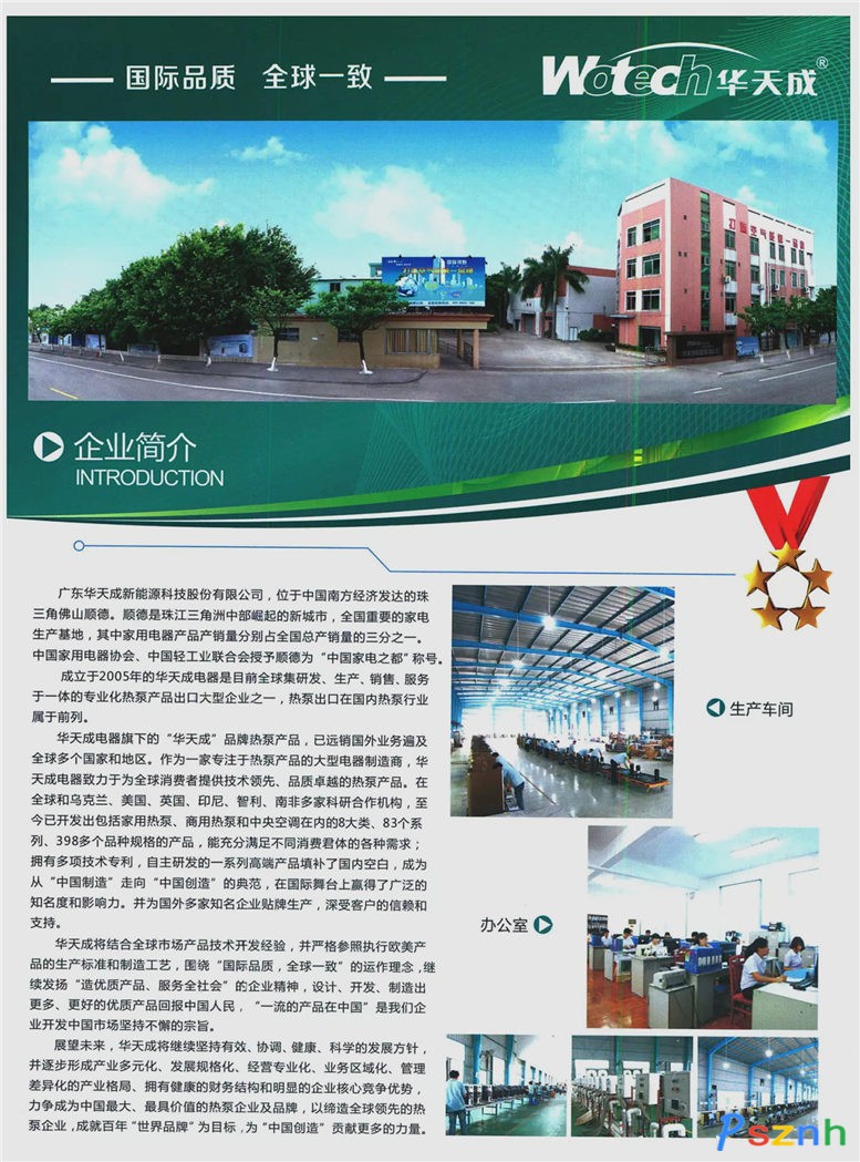 广东华天成新能源科技股份有限公司,生产:空气能热水器、烘干热泵、暖通设备,位于中国南方经济发达的珠三角佛山顺德。顺德是珠江三角洲中部崛起的新城市,全国重要的家电生产基地。中国家用电器协会、中国轻工业联合会授予顺德为“中国家电之都”称号。成立于2005年的华天成电器是目前全球集研发、生产、销售、服务于一体的专业化热泵产品出口大型企业之一 。 华天成电器旗下的“华天成”品牌热泵产品,已远销国外,业务遍及全球多个国家和地区。 作为一家专注于热泵产品的大型电器制造商,华天成电器致力于为全球消费者提供技术领先、品质卓越的热泵产品。 在美国、英国、乌克兰、印尼、智利、南非等多个国家都有科研合作机构,至今已开发出包括家用热泵、商用热泵和中央空调在内的8大类、63个系列、380多个品种规格的产品,能充分满足不同消费群体的各种需求;拥有多项技术专利,自主研发的一系列高端产品填补了国内空白,成为从“中国制造”走向“中国创造”的典范, 在国际舞台上赢得了广泛的知名度和影响力。 并为国外多家知名企业贴牌生产,深受客户的信赖和支持。
