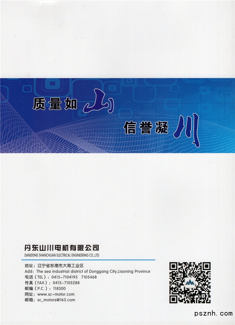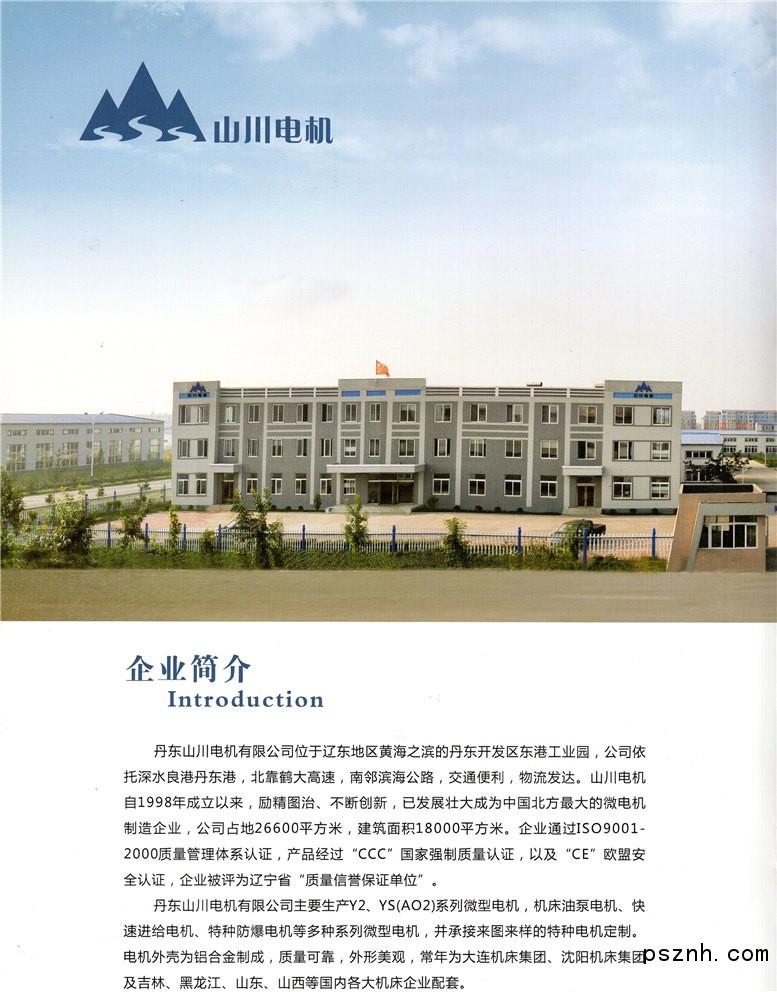 丹东山川电机有限公司位于辽东地区黄海之滨的东港市开发区大海工业园,自1998年建厂以来,励精图治、不断创新,现已成为中国北方电机制造龙头企业,公司占地26600平方米,建筑面积18000平方米。企业通过ISO9001质量管理体系认证,产品经过“CCC”国家强制质量认证,以及“CE”欧盟安全认证,企业被评为辽宁省“质量信誉保证单位”。