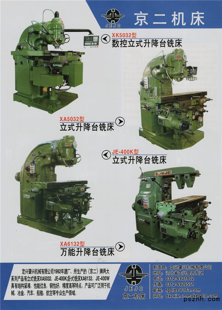 公司1992年建厂,是一个规模较大且技术力量雄厚的机械专业制造厂。公司生产的《京二》牌两大系列产品有立式铣床XA5032,JE-400K;卧式铣床XA6132,JE-400W具有结构紧凑,性能优良,钢性好,精度高等特点。产品可广泛用于机械,冶金,汽车,船舶,航空等专业生产领域。公司生产设备精良,检测手段完善。以保证交到客户手中的每一台机床都是精良的产品及完善的售后服务,是我们向每一位客户的承诺。