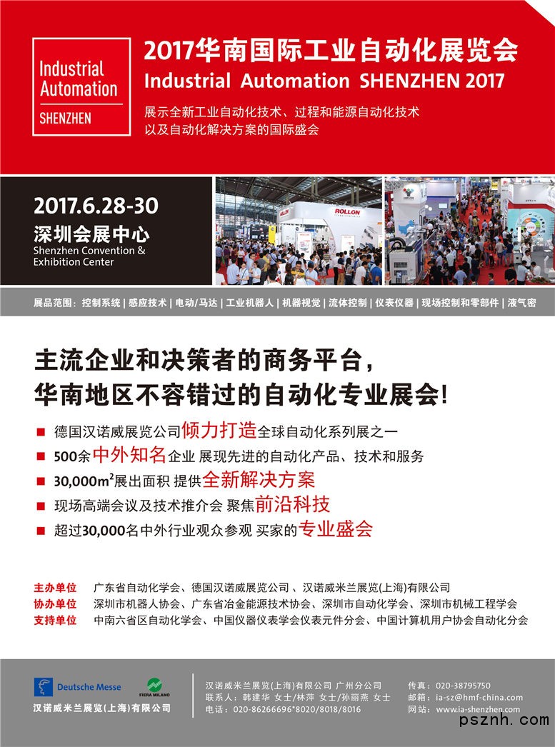 集聚产业效应,助力智造升级,2017华南国际工业自动化展览会由广东省自动化学会、德国汉诺威展览公司、汉诺威米兰展览(上海)有限公司主办。2017华南国际动力传动与控制技术展览会和2017华南水展由汉诺威米兰展览(上海)有限公司主办。下届展会将于2018年6月举行。
