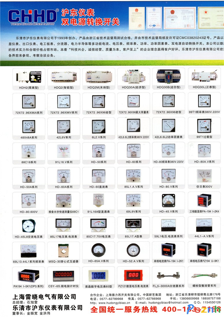 上海雷晓电气有限公司企业简介沪东电器有限公司系中国船舶工业总公司联营企业。专业开发、生产制造安装式船用广角电表及船用接线排和船用断路器开关等系列产品,公司凭借自身多年丰富的开发和生产制造经验、先进的生产检测设备、精湛的制造工艺及严格的企业管理,依靠技术进步求发展,以稳定可靠的产品质量和良好的服务赢得了用户的信任。本厂注重产品质量的控制和改善,重视质量体系的完善和提高,所生产的产品符合GB/T7676-1998(idt IEC60051)和ie1010标准。质量体系通过中国船级社认证公司ISO9001-2000认证。