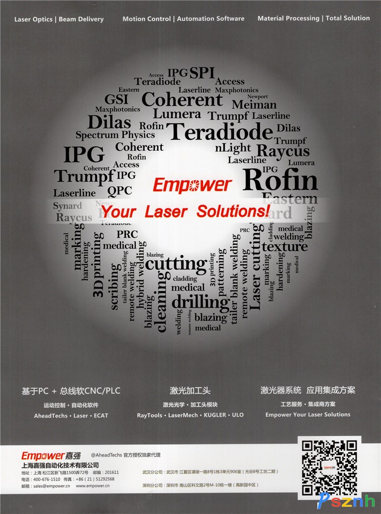 我们专注于工业激光和自动化技术的融合集成,结合国际知名激光光学及加工头模块RayTools,Lasermech,Kugler,ULO Optics等品牌和基于行业最先进的EtherCAT工业总线的自动化方案品牌AheadTechs等平台,立足本土,逐步推出适合设备集成商OEM的各行业的完整解决方案及工艺备品配件服务,涵括各种工业激光机器人,五轴三维激光切割焊接机床,500W/1kW/2kW/4kW光纤激光平面切割,4kW二氧化碳激光平面切割,导光臂三维非金属切割焊接,光纤激光远程焊接,高速高精度陶瓷玻璃打孔划线,金属表面毛化热处理等等成熟的激光光路和总线式基于PC的软 CNC / PLC 自动化控制解决方案,为客户提供稳定灵活的开放平台,顺应下一步智能激光制造的分布式网络化发展趋势。