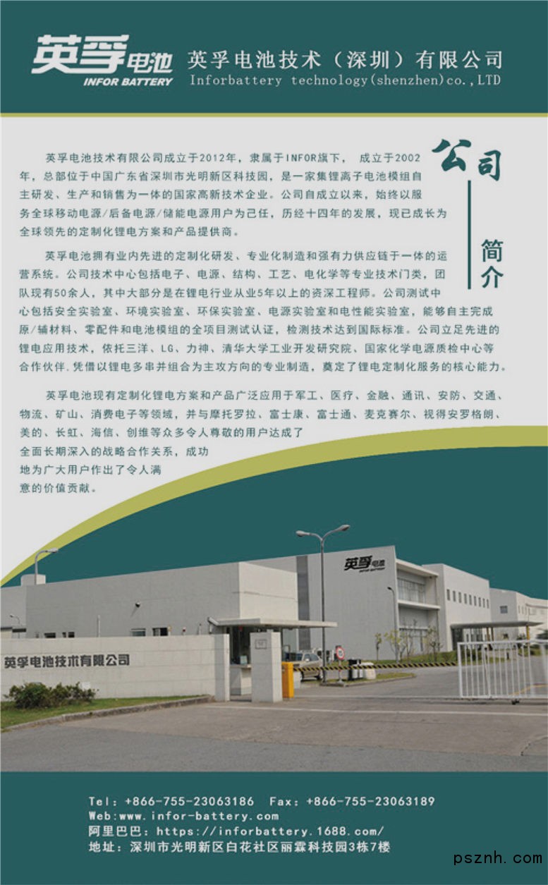 英孚电池拥有业内先进的定制化研发、专业化制造和强有力供应链于一体的运营系统。公司技术中心包括电子、电源、结构、工艺、电化学等专业技术门 类,团队现有50余人,其中大部分是在锂电行业从业5年以上的资深工程师。公司测试中心包括安全实验室、环境实验室、环保实验室、电源实验室和电性能实验 室,能够自主完成原/辅材料、零配件和电池模组的全项目测试认证,检测技术达到国际标准。公司立足先进的锂电应用技术,依托三洋、LG、力神、清华大学工 业开发研究院、国家化学电源质检中心等合作伙伴,凭借以锂电多串并组合为主攻方向的专业制造,奠定了锂电定制化服务的核心能力。