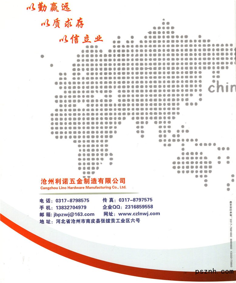 沧州利诺五金制造有限公司成立于2012年(原南皮县长松五金厂)。公司新址地理位置优越,交通便利。坐落于南皮五金产业区中心地带。近年来,公司不断加强、完善硬件设施。在提高生产效率、完善品质的同时,更为客户提供了个性化、全方位、高水平的服务。
