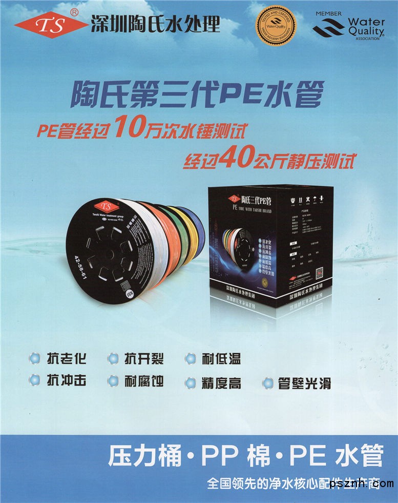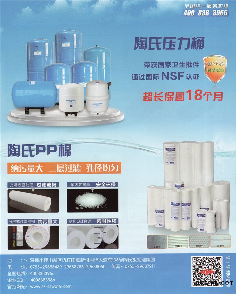 深圳市陶氏水处理设备技术开发有限公司国内最专业净水器PE水管压力桶PP棉滤芯滤瓶膜壳等净水机,纯水机配件生产批发厂家。陶氏品牌PE水管,PP棉滤芯,压力桶,滤瓶,膜壳畅销全国近30多个省,市,自治区以及直辖市,并远销北美,欧洲,中东,东南亚等五十多个国家和地区。2015年入驻美国WQA,成为净水安全品质保障协会会员,并荣获美国NSF认可证书,国内卫生部颁发涉水批件,品质保证,选购无忧。