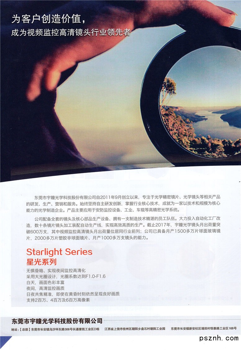 宇瞳光学专注于光学精密镜片、光学镜头等相关产品的研发、生产、营销和服务,为全球客户提供性能卓越的镜头和光学技术支持。产品主要应用于安防视频监控设备、智能家居、机器视觉、车载等高精密光学系统。