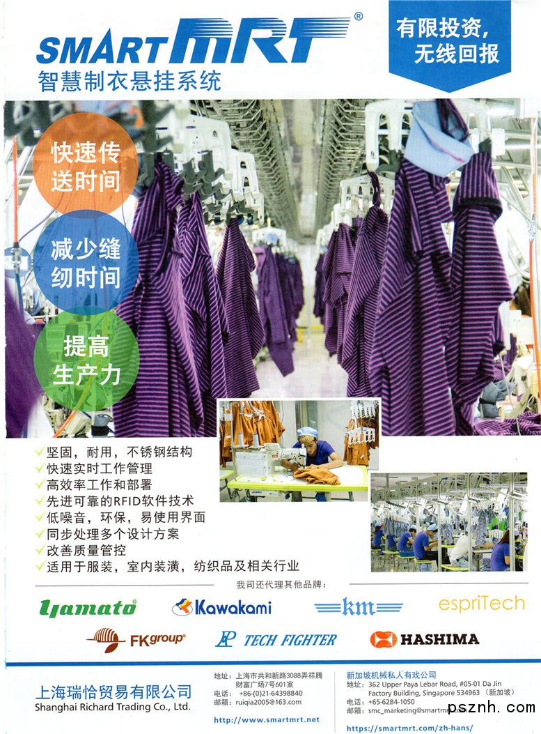 成立于1977年的新加坡机械有限公司(SMC)是全球领先的企业公司,为服装和纺织制造行业提供创新的,高性价比的,采用先进技术的高质量机器及集成解决生产方案。我们在1998年制造的 SmartMRT 智慧制衣悬挂系统,入围全球最畅销和最值得信赖的单位生产吊架系统之一。今天,我们在马来西亚,中国设立分公司和办事处。无论客户在世界任何一个地方,我们承诺为您提供优质的培训和售后支持,以最大限度地提高您的潜在价值,满足您的每一个要求,为了您的长期成功。同时,我们也是一站式服务中心,只从国际建立品牌(Optitex, 羽岛 Hashima, 川上 Kawakami, FK Group, 等等)销售最创新又高质量的机器、软件、备件等,提高您全厂的生产力。