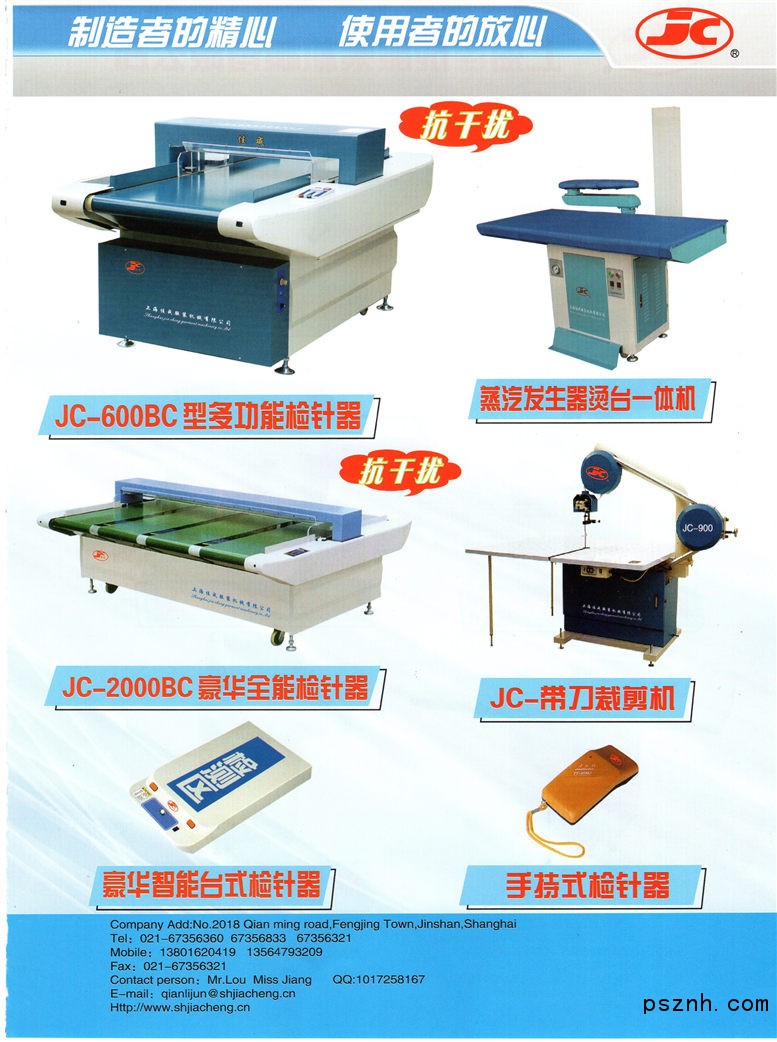 本公司专业生产以“佳成”为品牌的检针机系列、整烫系列、验布系列以及水洗设备系列。公司坚持“质量第一,用户至上”的企业宗旨,不断加强技术改造和产品的开发创新。系列产品深受全国各地客户的好评,价格合理,畅销全国各地。