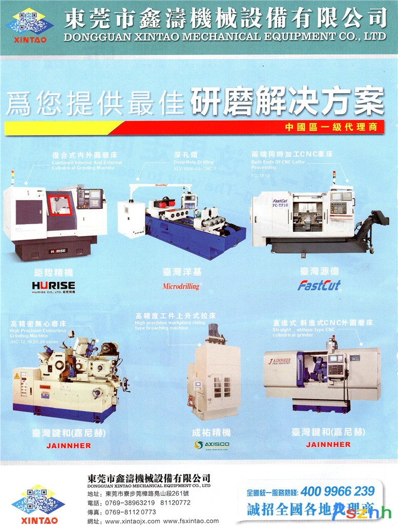 东莞市鑫涛机械设备有限公司成立于2006年,是台湾键和无心磨床(JANNHER)指定大陆地区销售和维修服务唯一单位、诺顿砂轮广东地区代理商。主要销售:无心磨床圆筒磨床内孔磨床NC/CNC无心磨床、 NC/CNC内孔磨床及各项无心磨床自动化设备、辅助设备(通过研磨自动送料机、通过研磨自动收料机、长物送料装置、长物收料装置、通过研磨多连接装置等)、机床冷却液净化分离(磁性分离机、磁铁过滤机、水力分离机、旋流分离器、离心过滤机)、台湾钜升精机CNC复合式内/外圆磨床、台湾普发高精密平面磨、冠长青球头机、源億两端同时加工机(双头机)、诺顿砂轮、嘉宝砂轮等,产品畅销全国,销售的产品广泛应用于航空航天、军工、汽车、摩托车、轴承、电机、复印机、家电、减振器、模具制造等各种机械制造行业。公司自成立以来在各届同仁的大力支持下,秉持“诚信经营、客户至上”的经营理念和员工优秀的综合素质,以卓越的技术、优秀的产品和完善的服务,赢得了良好的信誉。