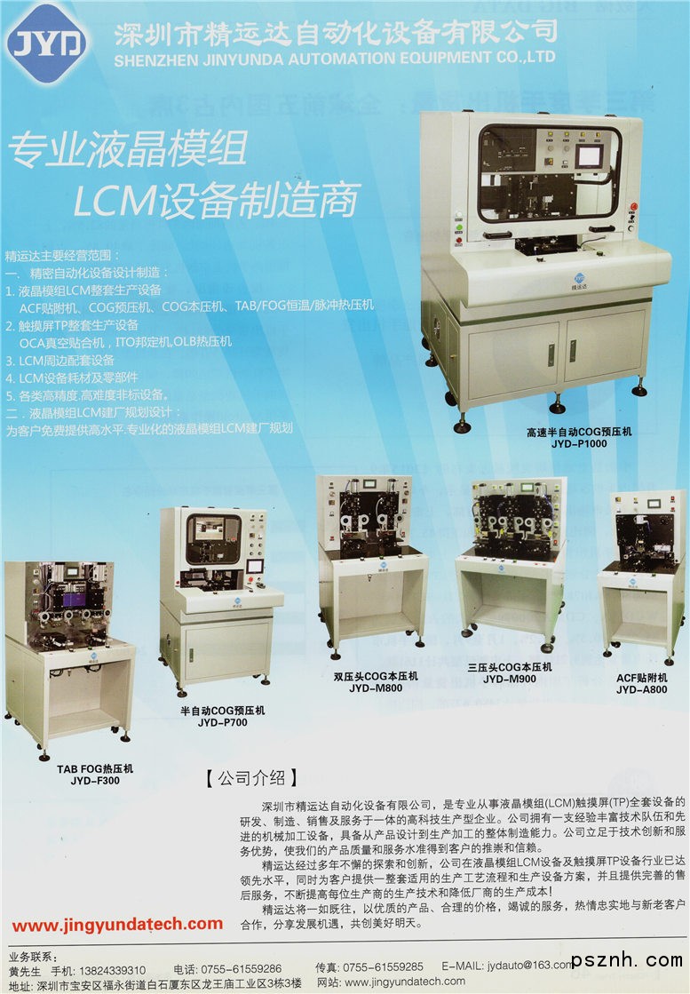 本公司秉着“以客为本、精益求精”的宗旨满足客户的需求,成功推出大、中、小尺寸系列全自动LCD/BL上料机、单/双边全自动LCD端子清洗机、单/多颗IC全自动COG邦定机、单/多段FPC全自动FOG热压机、on-cell 全自动FPC热压机、全自动三合一点胶机、全自动LCM保护胶晾干机、全自动背光模组组装机、半自动COG、FOG、ACF设备、LCM周边等其他设备。