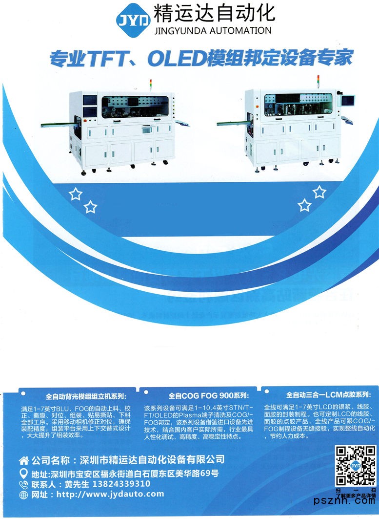 深圳市精运达自动化设备有限公司,专注LCM液晶模组自动化设备的研发、制造、销售及服务于一体的国家级高新技术生产企业。目前公司拥有厂房面积约6000㎡,近百人专业研发、生产管理、品质管理、售后服务团队,设有精密机加中心,具备从产品设计到生产加工的整体制造能力。自成立以来,以精湛的技术、优良的品质、良好的售后服务于客户,现已成为业内知名的LCM整线自动化设备解决方案商。