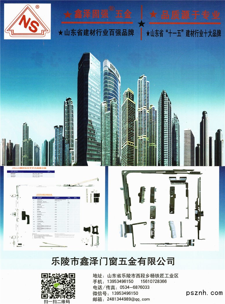 山东乐陵鑫泽五金制品有限公司是生产断桥铝门窗配件和塑钢门窗配件的专业厂家,拥有知名品牌牛氏固强,鑫泽。誉满业内。公司主要·生产多种角部铰链,合页,传动器,执手,风撑,四连杆,锁具等100多个品种千余种规格样式,产品已被天津市大港汇丰园.石家庄师范大学等全国数百家单位广泛推广使用.天津市鑫强达铝塑门窗配件有限公司是鑫泽五金在天津设立的中国天津首家中高档断桥铝·塑钢门窗配件生产制造造销售企业.直接为京津地区的开发商和门窗企业降低采购成本,自产自销。公司秉承忠信‘厚德;勤奋’图强的企业精神,赢于诚,专于质,遵合同守信用。公司完善的售后服务系统,一流的品质,让你买的放心用的舒心.