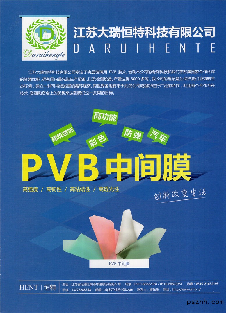 公司专注于聚乙烯醇缩丁醛(pvb)功能膜、普通膜及聚乙烯醇缩丁醛(pvb)的循环再利用的研发、制造及应用推广。广泛应用在光伏、航天、国防、建筑、汽车等众多领域其聚乙烯醇缩丁醛,公司已通过ISO14000环境管理体系认证、ISO9001 2008质量体系认证。