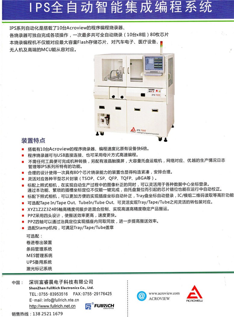 深圳富睿晨电子科技有限公司是IC编程及测试服务公司并为生产工厂提供半导体自动化解决方案。在FullRich,提供产品技术及生产支持服务,为客户重点提供符合成本效益的IC编程、测试及自动化解决方案(包括小批量、大批量及外包服务)。在中国半导体高速发展的今天,FullRich有着显著的增长,针对半导体工厂、芯片通路商、手机制造商、汽车电子、消费数码电子及EMS代工厂提供半导体编程、测试的专业服务。并在华南、华东设立烧录、测试服务中心及技术支持中心,加强本地化服务支持,以达到公司高质量、高标准、高效率的服务理念为最终目标而努力。