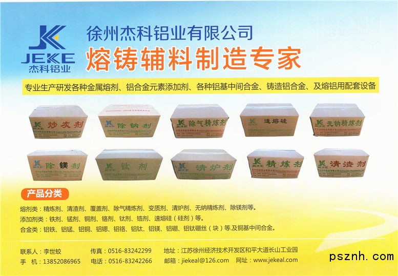 徐州杰科铝业有限公司是一家专业生产研发各种金属熔剂、铝合金元素添加剂、各种铝基中间合金、铸造铝合金、及熔铝用配套设备的专业企业,公司坐落国家级经济开发区—徐州市经济技术开发区内,企业拥有专业研发队伍并联合国内多家科研院所、行业专家进行铝熔铸技术的开发,为国内大中型铝加工行业提供熔铸辅料及技术支持。