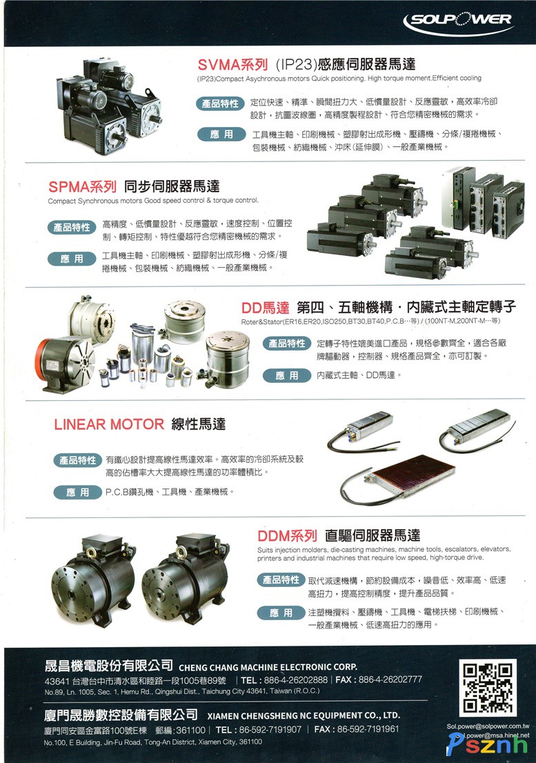 晟昌機電的產品遍及國內外市場,產品線大範圍的涵蓋機械業需求。工具機械方面,如C軸馬達、DD馬達、內藏式主軸馬達、線性馬達…等。產業機械方面,一系列的伺服馬達有最高轉速24000RPM的SVM系列、最大紐力到18849NM的SPMA/DDM系列,配合機械的需求,可應用在PCB鑽孔機(Tapping center高速鑽孔攻牙機)、分條機械、印刷機械、裁紙機械、塑膠射出成型機、銅鐵加工機械…等。