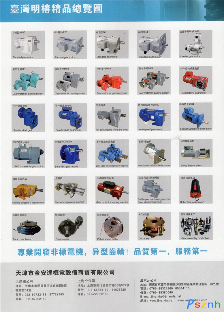 代理台湾品牌传动产品:北译小电机、变速机、刹车离合器、晟邦减速电机、欧权分割器、成奕减速机、东光鼓风机、嘉裕单相电机、富田(刹车/变频/感应伺服)电机、等傳動機械產品的銷售及售後服務。