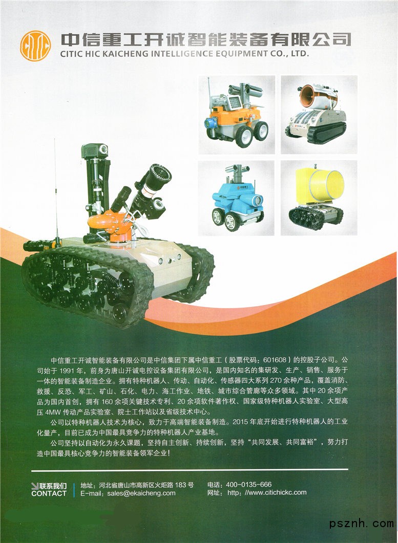 作为中国最早研制特种机器人的企业之一,公司在中国机器人发展史上创造多项第一,多项核心技术持有先发优势,尤其是基于特殊工况和高危环境下的特种机器人产业,已成为中国最具竞争力的特种机器人产业基地。产品涵盖履带式机器人平台、水下机器人平台、巡检机器人平台、管道机器人平台、钻孔探测机器人平台五大系列,涉及多个应用领域。灾区侦测机器人是唯一获得国家安标证和防爆证的井下侦测救援机器人,防爆消防灭火侦察机器人是唯一获得防爆认证和消防认证的消防机器人。