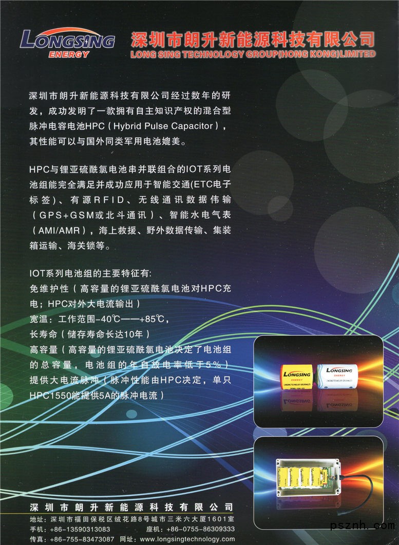 近几年公司依托于香港母公司,积极与国际著名的科研机构合作,成功研发了宽温物联网电池(由复合脉冲电容并联锂亚硫酰氯电池组成),该电池可以在-40℃-+85℃温度范围内稳定的工作,突破了锂离子电池与锂亚硫酰氯电池的技术瓶颈,并申请了30余项发明专利。我们将不断的创新研发新的产品,以满足未来物联网技术发展的需要。如智能交通、集装箱智能系统、GPS定位系统、海底定位、物流运输系统等。
