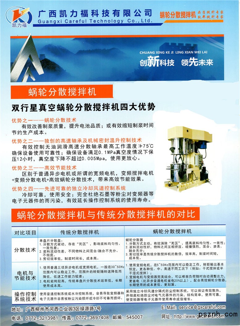 广西凯力福科技有限公司(以下简称凯力福)位于广西工业重镇柳州市,地处东盟经济圈,面向东南亚,背靠大西南,是一家集专用精细化工搅拌/分散/真空混合设备研发、生产、销售一体化、拥有先进的理化、计量、试验、检测等设施和完善的质量保证体系的高技术企业,公司拥有十几项化工机械专业领域的国家专利,具有年产化工搅拌/分散/真空混合设备1000台套的能力。