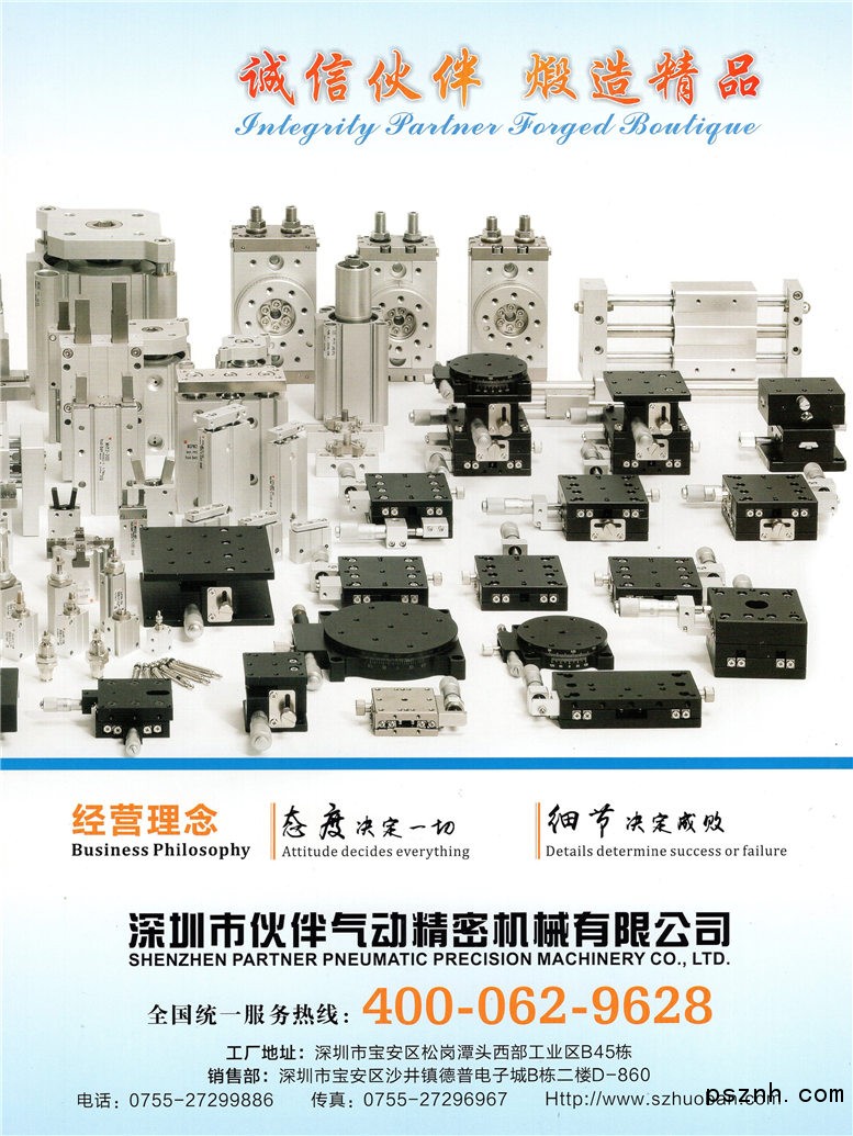 面对经济全球化的挑战,深圳市伙伴气动精密机械有限公司坚持“诚信、踏实、优质、一流”的发展方向,不断创新;大力引进国内外先进设备、高端技术和优秀人才,提高综合竞争力;整合资源、发挥优势,增加新的经济增长点;继续深化“态度决定一切细节决定成败”的企业理念,努力将“伙伴气动”打造成中国气动行业的名优品牌。