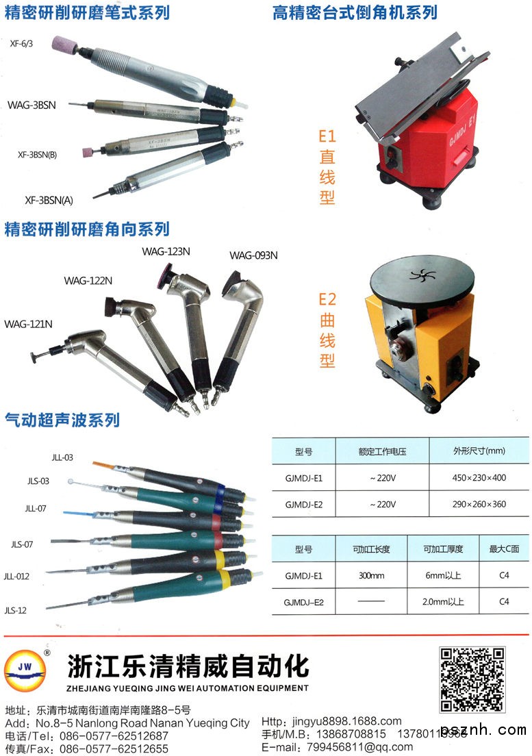 乐清市精威自动化设备厂(普通合伙)地处温州乐清雁荡山山脊南,依山傍水,风景秀丽。本企二十世纪末开始生产微型气动研磨工具,陆续生产精威智能攻丝机系列、悬臂式钻攻两用机、倒角机系列等,通过不断创新和累积数十年机械制造技术之精华,如今研发生产了高精密钻头研磨机系列和端铣刀研磨机系列。获得数项国家发明专利,填补了国内外的技术空白。精威人凭着精湛的设计制造能力和富有激情的开拓创新精神,让技术力量不断雄厚,让技术经验不断丰富,让企业不断壮大,勇攀高峰,让精度说话。本企不但强化技术开发和生产制造,更重视产品的质量及售后服务体系的建立和完善,为了开拓更大的市场,我们坚守“质量为上,诚信为本”的宗旨,愿与国内外企业、单位、人士进行真诚合作,共创双赢!