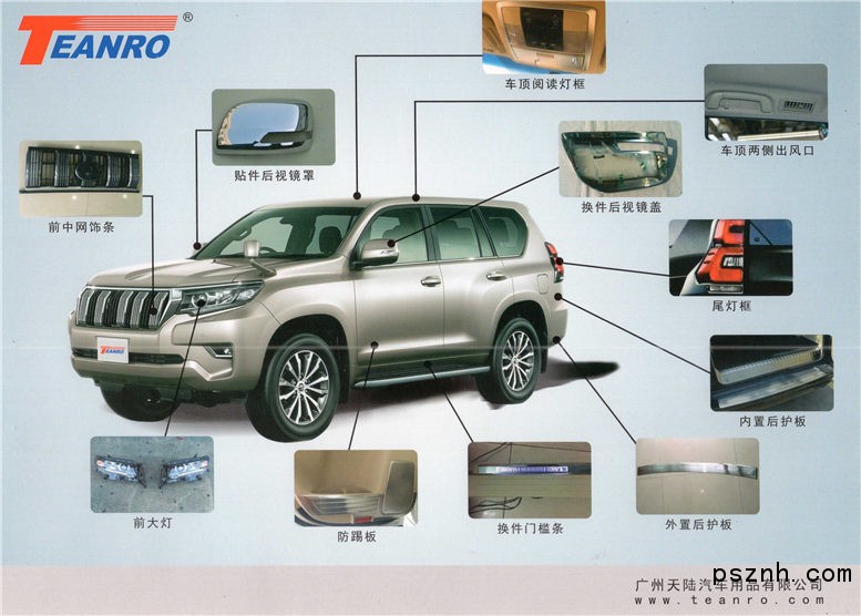 公司经营主要产品包括:ABS电镀改装中网系列、塑料电镀精品装饰系列(前后灯框、拉手、门碗、不锈钢中柱、后视镜、雾灯框、边灯框、油箱盖)、注塑豪华晴雨挡系列,车顶行李架,侧门踏板等种类达数千种产品。经营的主要汽车品牌丰田、本田、三菱、现代、奔驰、JEEP等中高端车型。