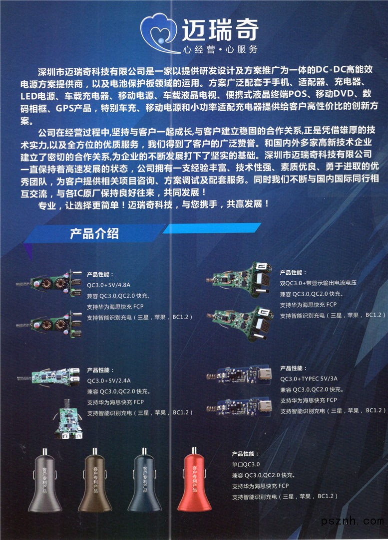 深圳市迈瑞奇科技有限公司是一家以提供研发设计,及方案推广为一体的DC-DC高能效电源方案提供商以及电池保护板领域的运用,方案广泛配套于手机、适配器、充电器、LED电源、车载充电器、移动电源、车载液晶电视、便携式液晶终端POS、移动DVD、数码相框、GPS产品,特别车充、移动电源和小功率适配充电器提供给客户高性价比的创新方案。