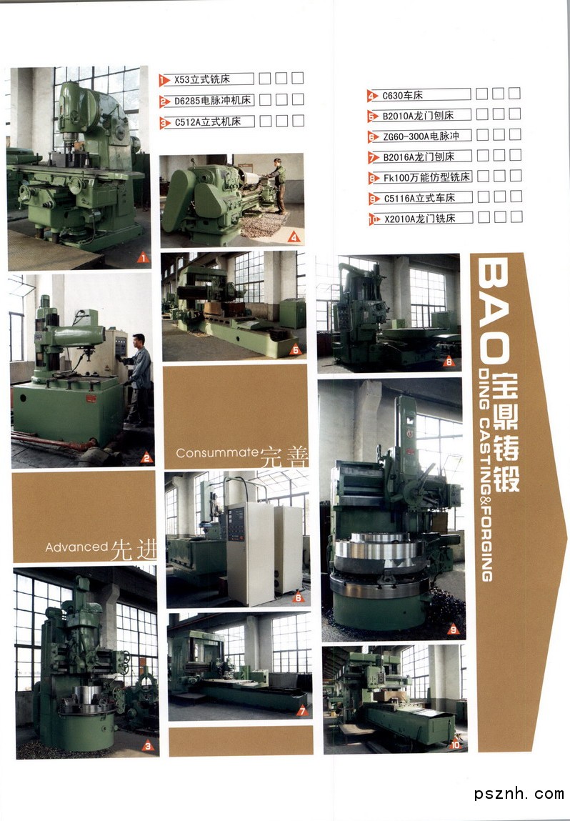 公司拥有先进的大型铸锻件生产设备10台套,其中:31,500KN水压机一台、40MN及20,000KN油压机各一台、8t及3t电液锤各一台、10t模锻锤一台、5t电弧炉一台、3t中频电炉3台;公司拥有长2米至11米台车式热处理电炉和深5米至13米井式热处理电炉共16台;公司还拥有重型、精密机械加工设备八十多台套,机加工、精加工及装配能力居于国内同行业领先水平。其中,镗铣数控加工中心13台,由意大利进口的数控镗铣中心PAMA4000加工范围达长19米,高度7米,载重100吨,加工精度< 0.007mm;大小磨床5台,其中最大数控外圆磨加工直径达2米,长度16米,磨削承重60吨;各式立车及立式车削中心15台,其中最大车削直径8米,加工高度5米,载重150吨;数控卧式车削车床15台,其中最大加工直径2.5米,长度16米,载重80吨;深孔钻镗床2台,钻孔直径达φ150mm,镗孔直径达φ1,000mm,长度达16米;另外,还有8台重要辅助设备,最大行车起重能力达100吨。