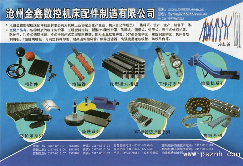 我公司主要产品有:各种材质的机床防护罩、工程塑料拖链、新型PVC柔性护罩、风琴式、圆桶式、铠甲式、卷帘式伸缩护罩、防护帘、TL桥式钢铝拖链、桥式全封闭式工程塑料拖链、矩形金属软管护套、DGT型导管护套、螺旋钢带护套、机床导轨刮屑板、T型撞块槽板、可调塑料冷却管、耐高温伸缩风管、纸带过滤器、高强度尼龙波纹管、铸铁平台等。