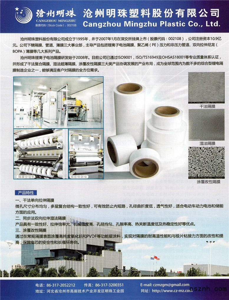 沧州明珠,目前在全国PE管道、BOPA薄膜和锂离子电池隔膜行业均处于领先地位。公司凭借具有国际先进技术水平的聚乙烯(PE)压力管道、非压力管道和双向同步拉伸尼龙(BOPA)薄膜、锂离子电池隔膜等几大系列产品,以及专业的产品售后服务团队,为全球客户提供优质的塑料管道系统、BOPA薄膜包装及锂离子电池隔膜专业三大解决方案,志创最值得信赖的国际塑料制造商。