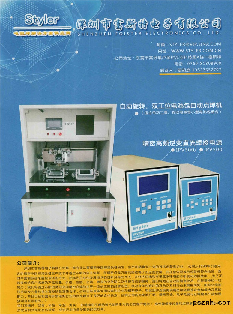 广州市斯特焊接设备有限公司(深圳市富斯特电子有限公司)是一家专业从事精密电阻焊接设备研发、生产和销售为一体的技术创新型企业, 公司从1998年引进先进的精密电阻焊接设备生产技术并通过不断的自主创新,在精密点焊方面已经取得了长足的发展,并在部分领域已经取得领先地位;面对中国制造越来越全球化的今天、在现代工业化发展技术的日新月异的今天,在经济环境和市场竞争环境的不断变化的挑战中, 为了不断提供给客户满意的产品质量、价格、性能、功能、更快的交货期以及快捷互动的服务,我们将倾注自己的精湛技术、创新精神和一切努力;我们将通过不断的努力来向精密点焊的世界一流供应商和品牌迈进。经过多年和客户的互动以及对行业发展的研究,配合公司的技术研发力量和相关高校试验室的合作,公司已经具备为国内电池企业和精密电子、电器部件连接提供精密电阻焊接设备和解决方案的能力,并且已经和国内许多电池行业的巨头建立了良好的合作关系;目前公司能为电池厂商、精密五金、电子电器行业等提供产品和焊接项目开发服务。