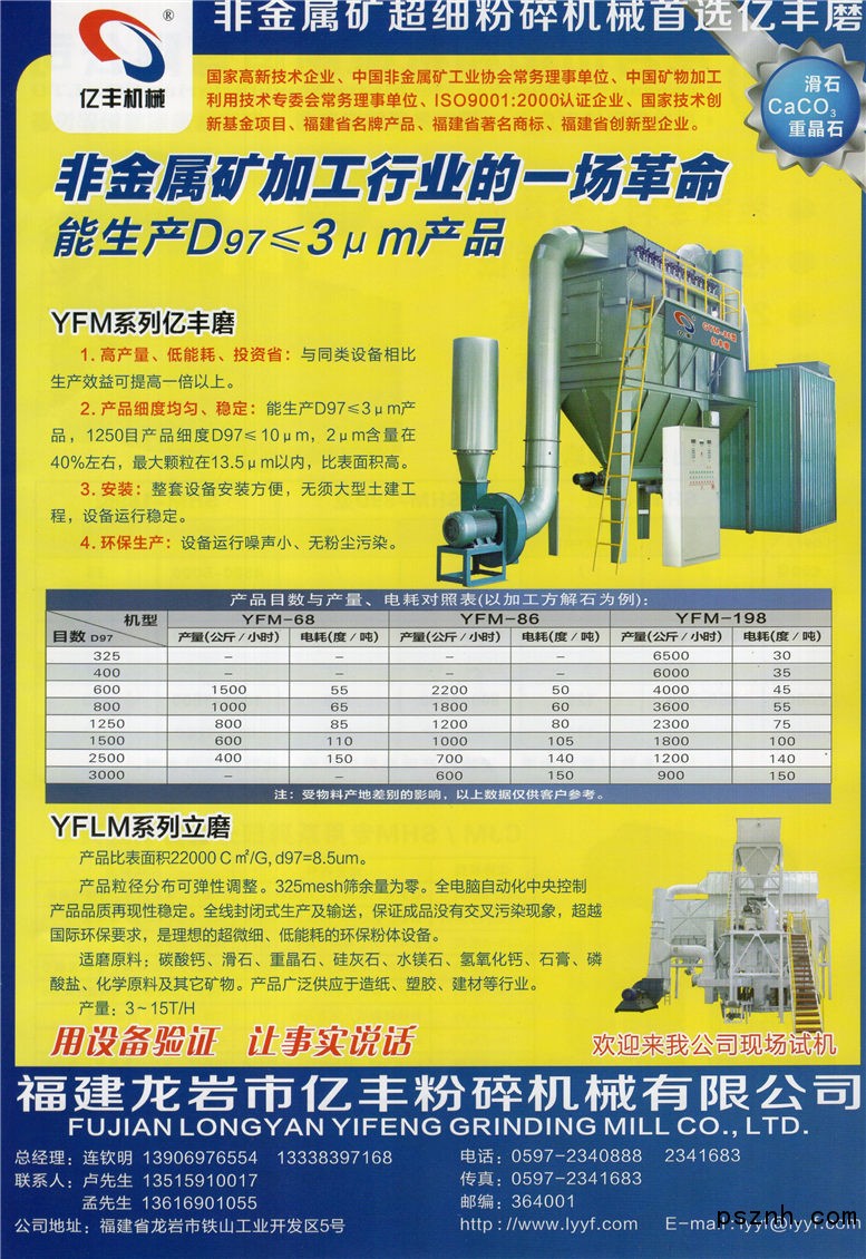 龙岩市亿丰粉碎机械有限公司创建于2002年,创建之初即与全国多家科研所、高等院校紧密合作,是中国非金属矿工业协会常务理事单位。本公司在高技术、高起点上组建,专业生产各类超细粉碎机械及各类分级机械、耐磨铸件并配套有大型的实验基地。已通过ISO9001国际质量管理体系认证。