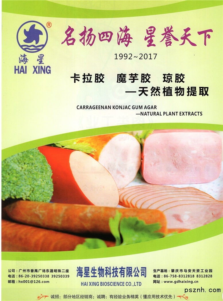 “海星”牌卡拉胶是一九九二年国家“星火计划”项目,公司拥有高素质的科研人员,与国内外一些大型科研机构和高等院校有着广泛的合作交流。产品原料来源于菲律宾、印尼等国家。本公司率先采用国际先进的生产和检测设备,生产出高品质卡拉胶,琼胶、魔芋胶和复合胶等产品。