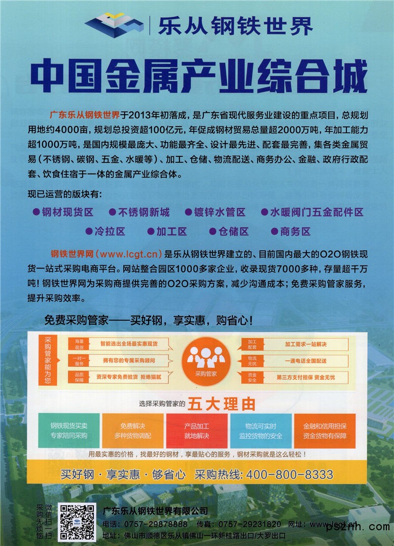 广东乐从钢铁世界有限公司是广东省现代服务业建设的重点项目,于2013年初落成。总规划用地约4000亩,规划总投资超100亿元,年促成钢材贸易总量超2000万吨,年加工能力超1000万吨。是国内规模庞大、功能齐全、设计先进、配套完善,集各类金属贸易、加工、仓储、物流配送、商务办公、金融、政府行政配套、饮食住宿于一体的金属产业综合体。 经几年发展,乐从钢铁世界硕果累累,超前的设计规划、全智能先进的配套服务、独具一格的优势,让钢铁世界发展迅猛,先后荣获“全国诚信示范市场”、“广东省诚信示范市场”、“推进流通现代化全国重点批发市场”、“中国生产资料(商贸)流通创新型企业”等称号