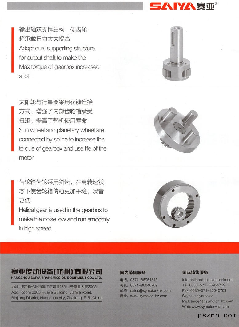 杭州赛亚传动设备有限公司始创于2009年,位于杭州市江干区。是一家致力于生产微型交流、直流齿轮减速电机、小型减速电机、伺服专用行星减速机,直流有刷和无刷电机等产品的集生产和销售为一体的公司。   公司生产的感应电机,可逆电机,力矩电机,小型减速电机,无刷直流电机,微型齿轮箱,硬齿面齿轮减速器,精密蜗杆,高精度行星齿轮减速器等产品都是我们的强项。产品具有寿命长、噪声小、体积小、重量轻、免保养、价格低等特点。 公司生产的产品可替代传统皮带减速的电机、摆线针轮减速机,还可替代德国、日本、 韩国同类齿轮减速电机。公司产品广泛应用于成套传输设备、自动化流水线、印刷包装机械、纺织印染机械、木工家具械、橡胶塑料机械等一些轻功自动化行业。   杭州赛亚传动设备有限公司实力雄厚,重信用、守合同、保证产品质量,以多品种经营特色和薄利多销的原则,坚持“诚信-创新-互利-共赢”,赢得广大客户的信任。