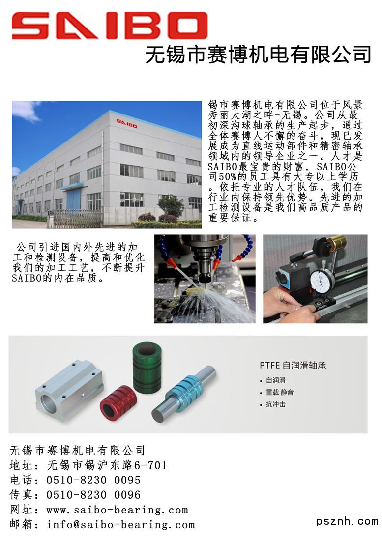 无锡市赛博机电有限公司位于风景秀丽太湖之畔-无锡。公司从最初深沟球轴承的生产起步,通过全体赛博人不懈的奋斗,现已发展成为直线运动部件和精密轴承领域内的领导企业之一。人才是SAIBO最宝贵的财富, SAIBO公司50%的员工具有大专以上学历。依托专业的人才队伍,我们在行业内保持领先优势。先进的加工检测设备是我们高品质产品的重要保证。公司引进国内外先进的加工和检测设备,提高和优化我们的加工工艺,不断提升SAIBO的内在品质。