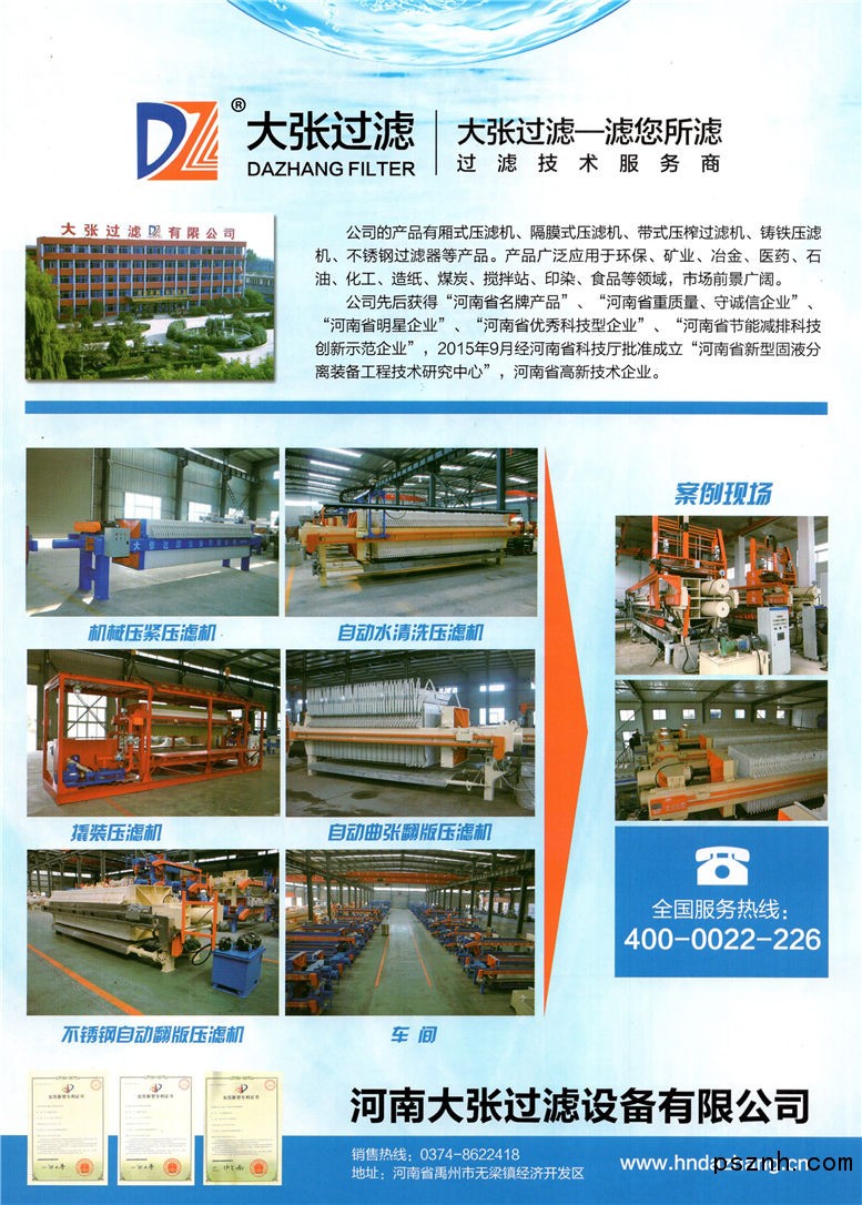 公司具有专业的自主产品研发团队,在产品设计上吸取了美、日、德等国的先进技术,并拥有增强聚丙烯滤板制作工艺等多项技术。公司自主研发的有板框式压滤机、厢式压滤机、隔膜式压滤机、带式压榨过滤机、铸铁压滤机、不锈钢过滤器等环保系列产品。大张压滤机已销往全国各地,并出口泰国、印尼、新加坡、伊朗、印度、斯里兰卡、菲律宾、印度尼西亚、越南、俄罗斯、香港等国家和地区,在化工、冶金、石油、化工、印染、陶瓷、食品、制药、建材、洗煤矿山及污水处理等行业得到了广泛应用。