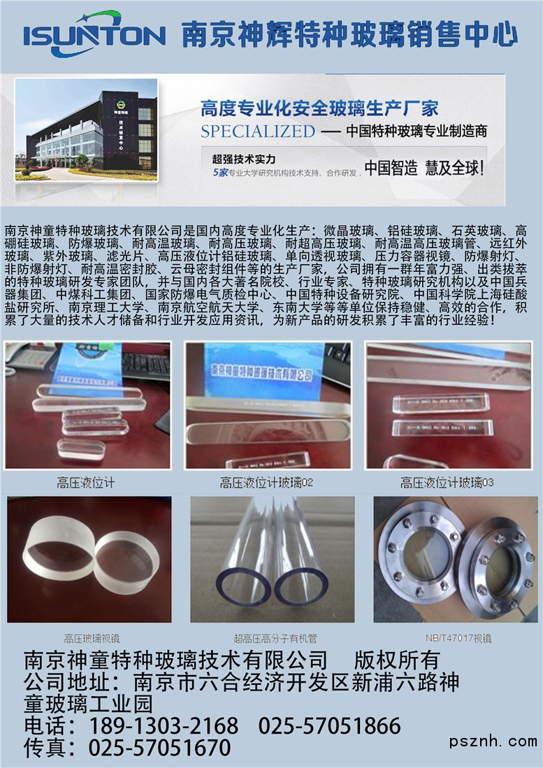 南京神童特种玻璃技术有限公司是国内高度专业化生产:微晶玻璃、铝硅玻璃、石英玻璃、高硼硅玻璃、防爆玻璃、耐高温玻璃、耐高压玻璃、耐超高压玻璃、耐高温高压玻璃管、远红外玻璃、紫外玻璃、滤光片、高压液位计铝硅玻璃、单向透视玻璃、压力容器视镜、防爆射灯、非防爆射灯、耐高温密封胶、云母密封组件等的生产厂家,公司拥有一群年富力强、出类拔萃的特种玻璃研发专家团队,并与国内各大著名院校、行业专家、特种玻璃研究机构以及中国兵器集团、中煤科工集团、国家防爆电气质检中心、中国特种设备研究院、中国科学院上海硅酸盐研究所、南京理工大学、南京航空航天大学、东南大学等等单位保持稳健、高效的合作,积累了大量的技术人才储备和行业开发应用资讯,为新产品的研发积累了丰富的行业经验